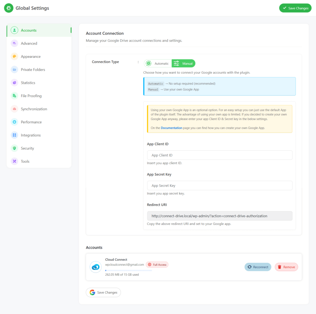 Manual: Create your own Google App and use it to connect your Google account with the plugin.