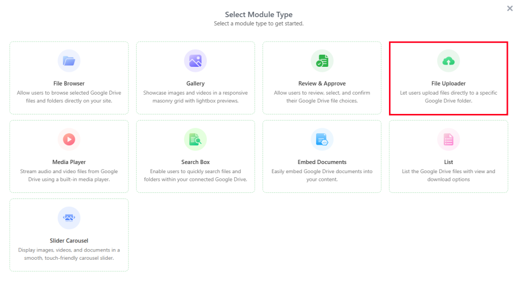With the help of the File Uploader Module, users can upload files to the specific selected Google Drive folder allocated by you. In this guide, we will elaborate on how to properly use and manage the File Uploader Module.