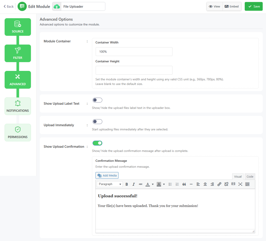 - Show Upload Confirmation: Show/ hide the upload confirmation message after upload is complete.