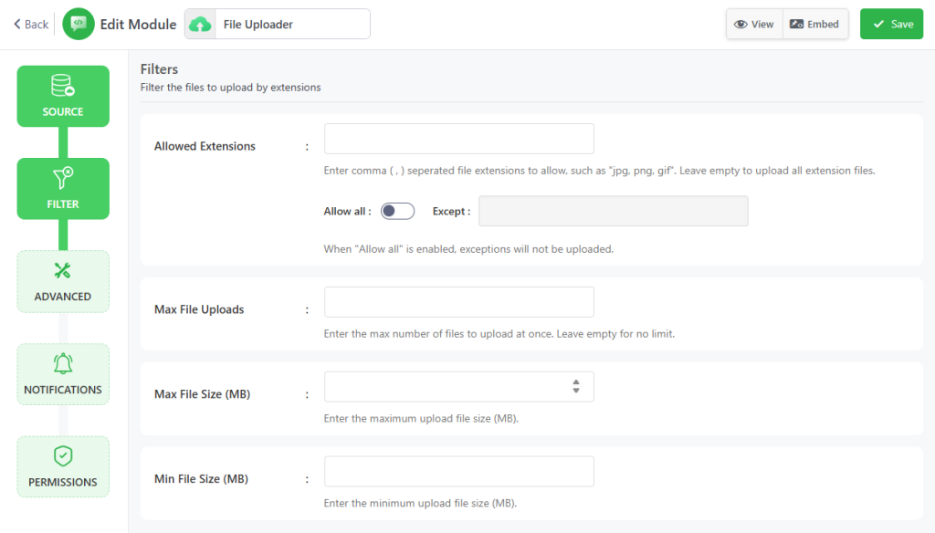 - Allowed Extensions: Enter comma (,) separated file extensions to allow, such as “jpg, png, gif”. Leave empty to upload all extension files.