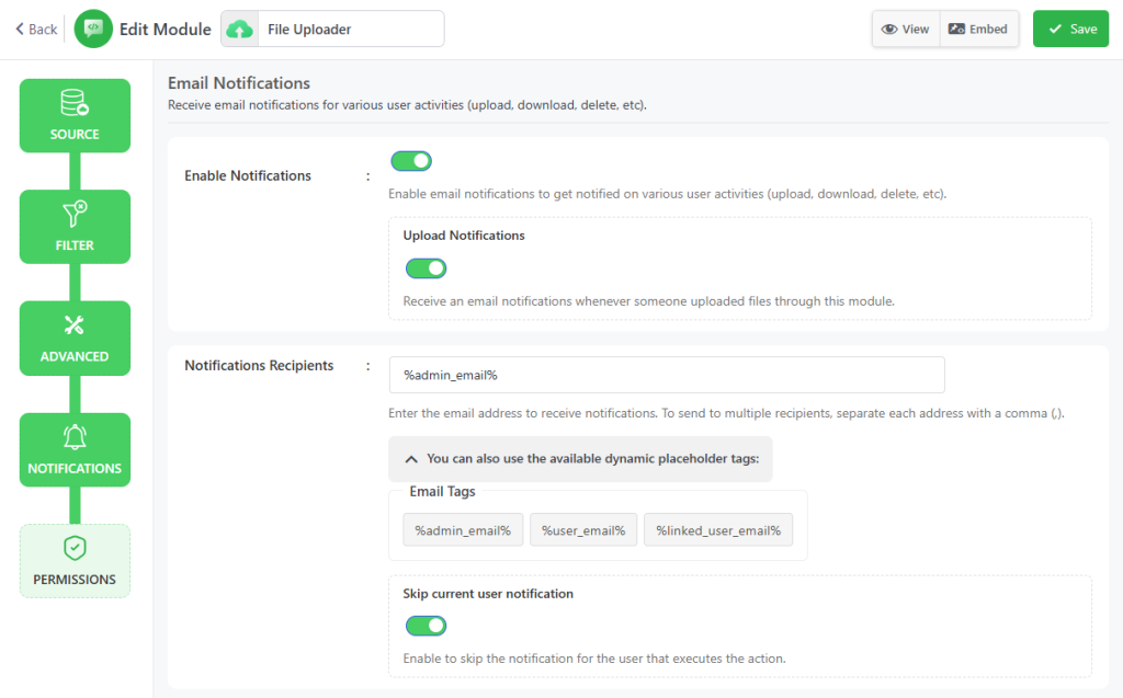 - Notification Recipients: Enter the email address where the notifications will be sent. Add multiple email addresses by separating them with a comma (,). Placeholder example: %admin_email%, %user_email%