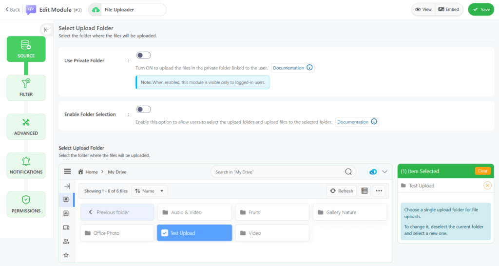 - Use Private Folder: Turn ON to upload the files in the private folder linked to the user. Note: If enabled this module will be visible only to logged-in users.