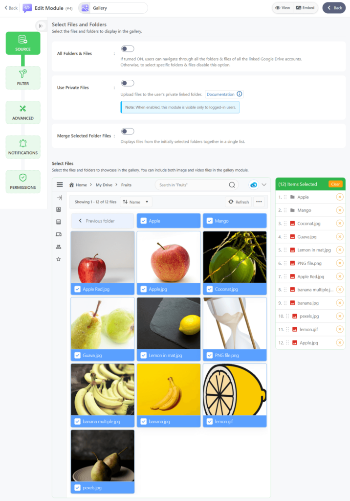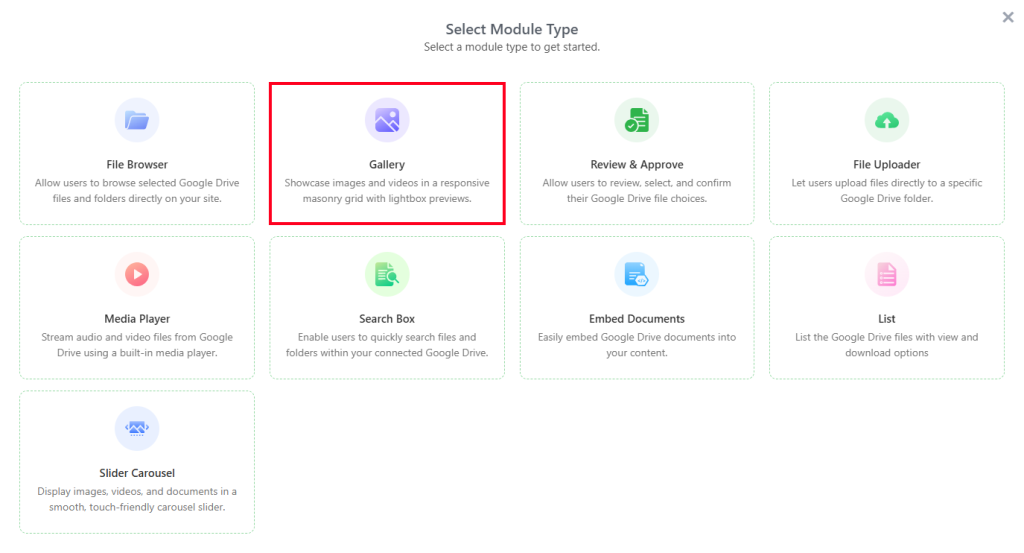 Using the Gallery Module, you can display your Google Drive images on your website in a masonry grid layout with a lightbox preview. This module lets you create a stunning photo and video gallery and display it to your users.