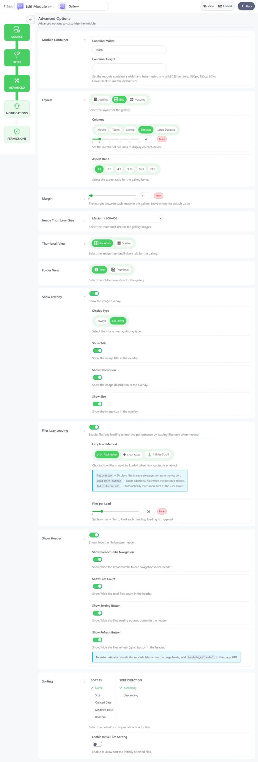 - Show Sorting Button: Show/ hide the files sorting options button in the header