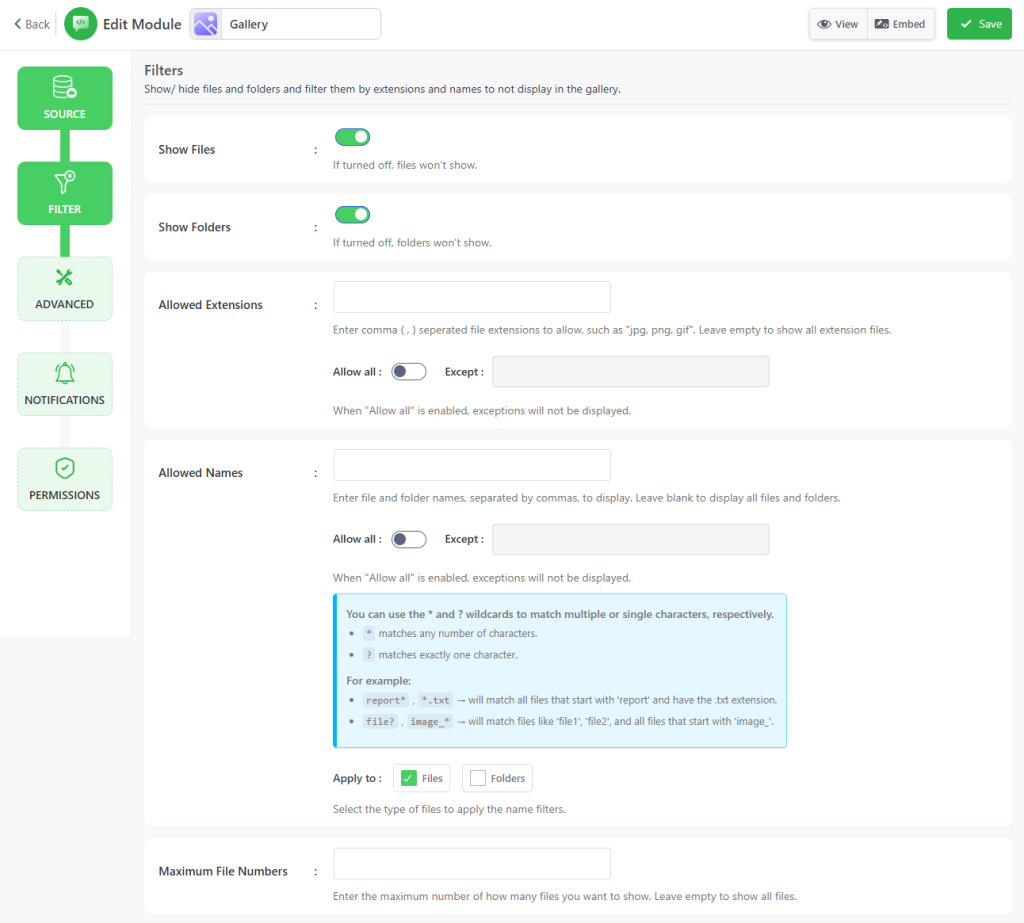 - Allowed Names: Enter file and folder names, separated by commas, to display. Leave blank to display all files and folders. When “Allow all” is enabled, exceptions will not be displayed. You can also limit files & folder.
