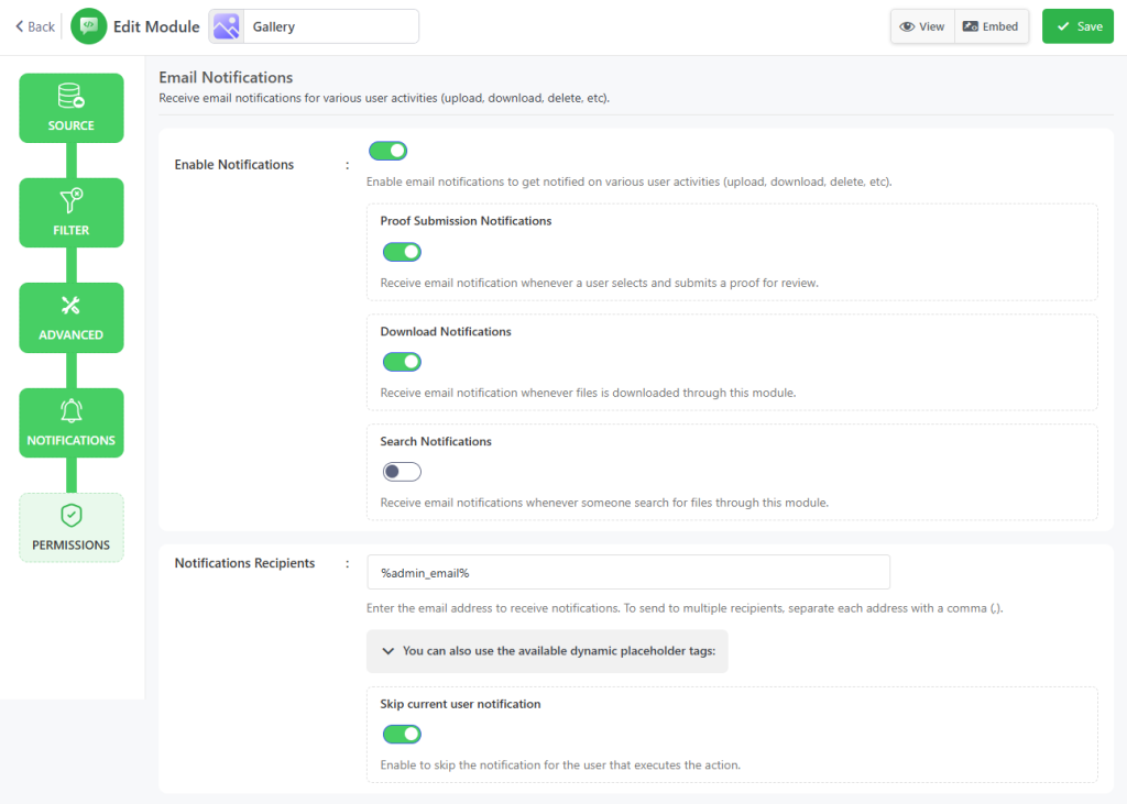 - Notification Recipients: Enter the email address where the notifications will be sent. Add multiple email addresses by separating them with a comma (,). You can also set the placeholder tags below as email recipients. Ex: %admin_email%, %user_email%, %linked_user_email%