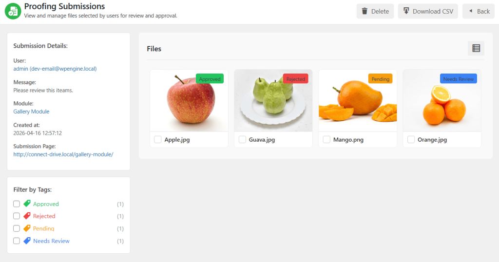 Now, once users send files, the admin will get an email notification to the given email address. As an admin, you also download submissions by clicking on the “Download CSV” button.