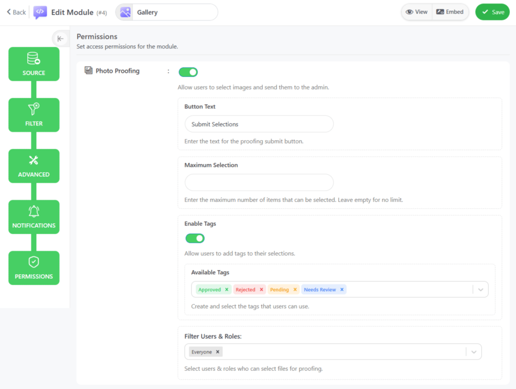 While configuring the Gallery module, you will notice multiple tabs on the left side. Navigate to the “Permissions” tab, where you will discover “Photo Proofing” settings.